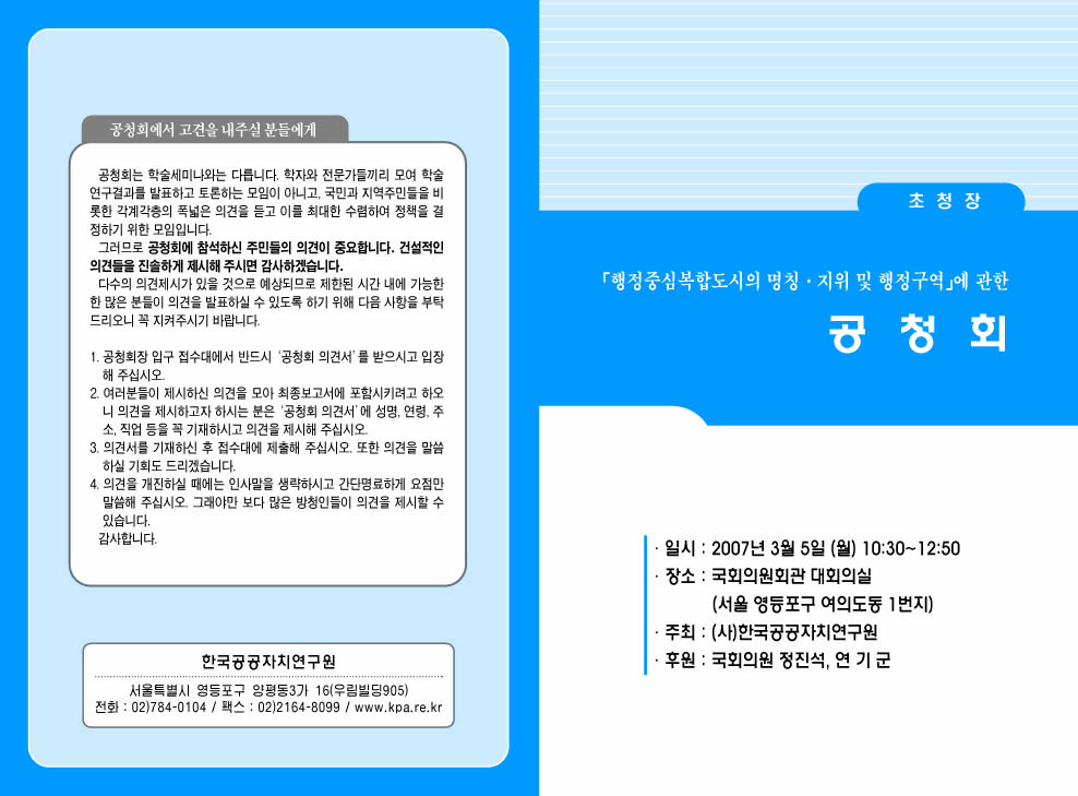 행정중심복합도시를 건설한다는 것은 국가의 백년대계에 속하는 중차대한 사안이므로 국 민, 지역주민과 전문가들의 의견을 수렴하고 지리적,역사적 여건 등을 고려하여 신중하 게 결정, 추진되어야 합니다. 이에 본원에서는 행정중심복합도시의 명칭, 지위 및 행정 구역에 관한 연구결과를 발표하고 지역주민을 비롯한 국민과 전문가들의 의견을 폭녋게 수렴하여 정책방향을 제시하기 위하여 아래와 같이 공청회를 개최하게 되었습니다. "행정중심복합도시의 명칭, 지위 및 행정구역에 관한 공청회" - 일시 : 2007년 3월 5일(월) 10:30~12:50 - 장소 : 국회의원회관 대회의실 - 주최 : (사) 한국공공자치연구원 - 후원 : 국회의원 정진석, 연기군 순서 1부(10:30~10:50) -개회식 / 사회 : 김현소 박사 -환영사 정진석 국회의원(국민중심당 원내대표) -환영사 이기봉 군수(연기군) -격려사 임채정 국회의장(열린우리당) -축 사 각 당 대표 2부(10:50~12:10) / 사회 : 정세욱 한국공공자치연구원장 -발표 소진광 교수(경원대 / 한국지방자치학회장) : 행정중심복합도시의 행정구역 김순은 교수(동의대) : 행정중심복합도시의 명칭 및 법적 지위 -토론 임경수 교수(성결대 / 한국도시행정학회장) 김명국 교수(안양대 / 한국지역개발학회 부회장) 김성배 교수(숭실대 / 한국지방자치학회 부회장) 이민부 교수(한국교원대 / 대한지리학회장) 방청인 의견청취(12:10~12:40) 발표,토론내용 및 의견 종합정리 : 결론(12:40~12:50) |