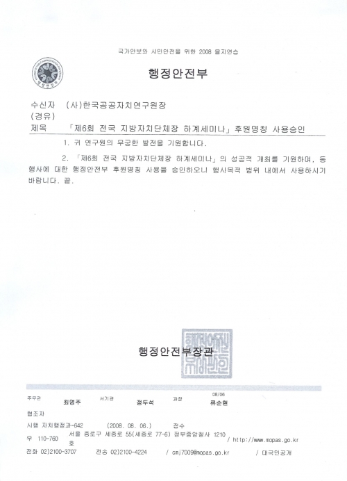 | 다음글 | 제6회 2008 전국자치단체장 하계세미나 안내 | ||